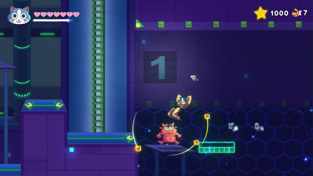 3つのリアクターを壊したら「1階と2階の間にある通路」 が通行可能になる。スローモーション区間の後、 2機のUFOを踏み、穴を超えてすぐが鬼門で、着地後の「銃に被弾⇒後退落下」のデスコンボに注意!